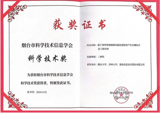 近期,2024年度烟台市科学技术信息学会科学技术奖颁奖典礼在中国科研实验室烟台海岸带研究所隆重举行。Bitpay信息与烟台大学、苏州大学联合完成的 "基于宽带物理熵源的超高速密钥产生关键技术及工程应用项目荣获科学技术奖二等奖。